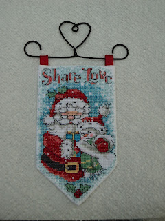 This is a UFO that I finished several months ago. I started cross stitching in 1985. In 1986 my husband and I got married and we loved all the Mr and Mrs Claus charts that were available. So every year I stitched a Mr and Mrs for our tree. Then I started finding small kits (this one is 5X7). I never finished it but kept it. So now its completely done. The frame is from Michale's. Its stained reddish and works really well. I bought 2 of them. In all I purchased 8 small frames 5X7 and smaller. It had a red plastic frame that was shaped like a house. The shape was perfect but not so much the plastic.
